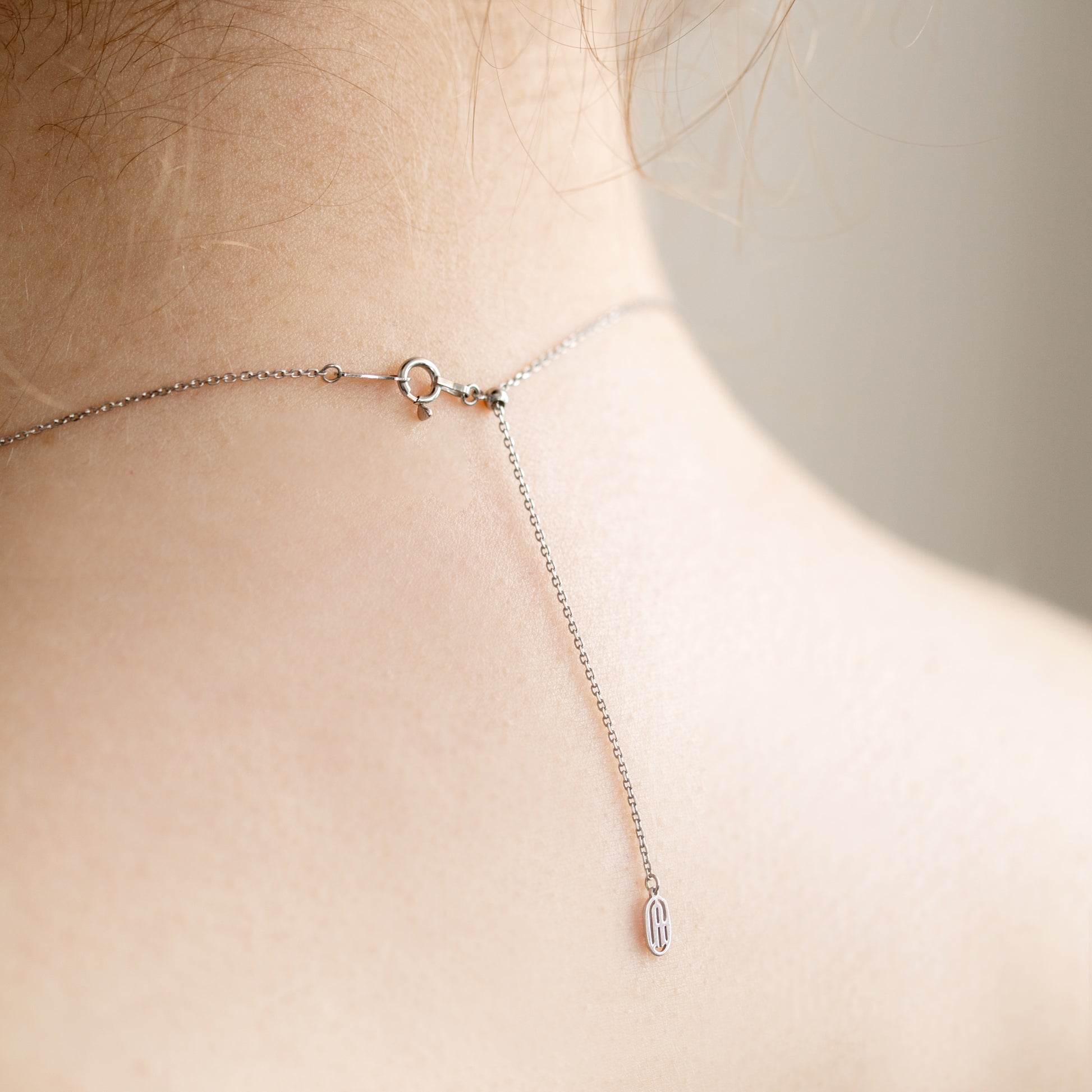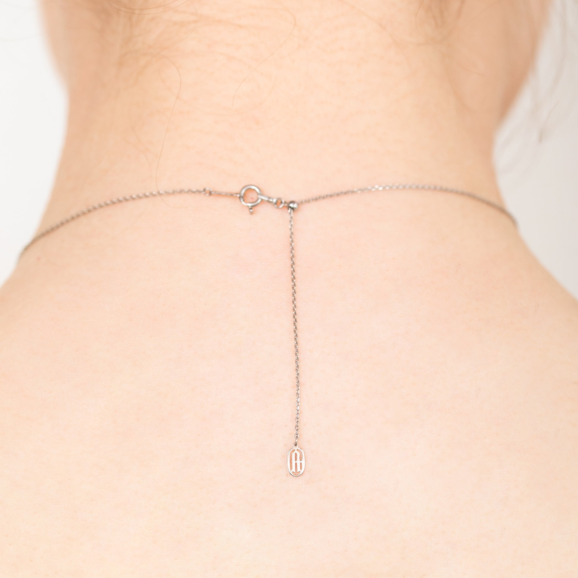 複雑にパヴェセッティングされたトップは、強さと繊細さをたたえて胸元で美しく煌めきます。 長さ調整のできるデザインなので、その日の装いに合わせて様々な表情を楽しんで。