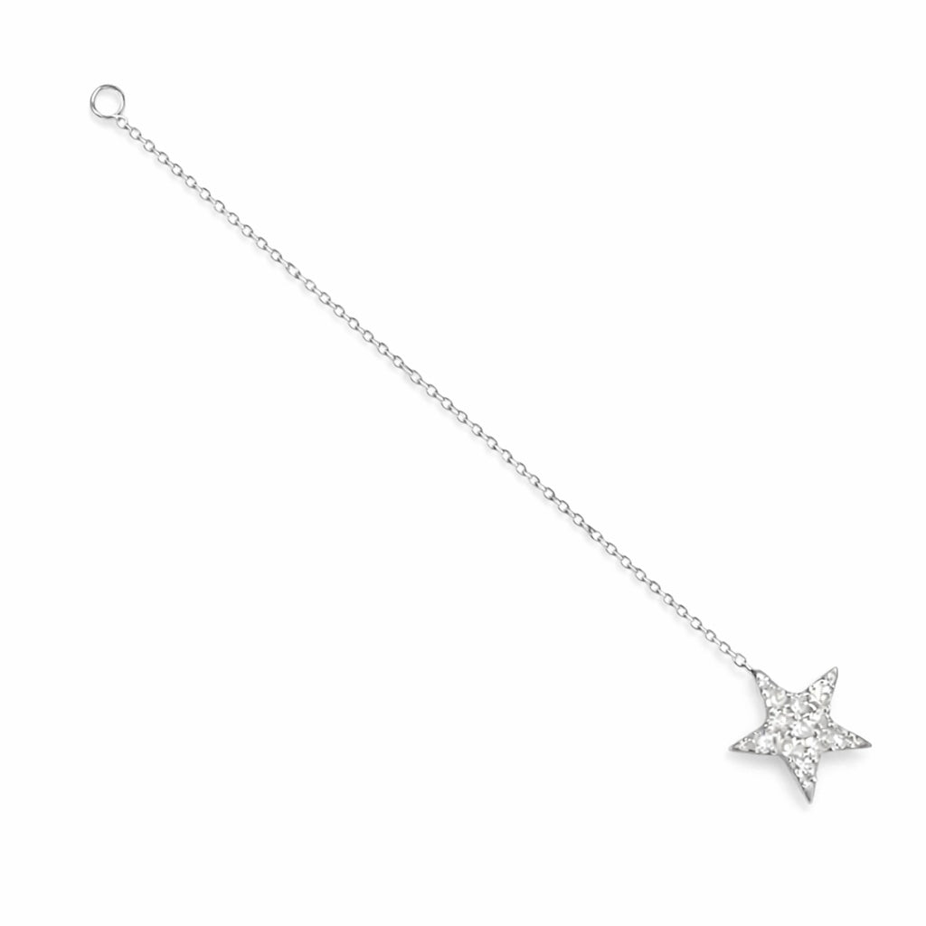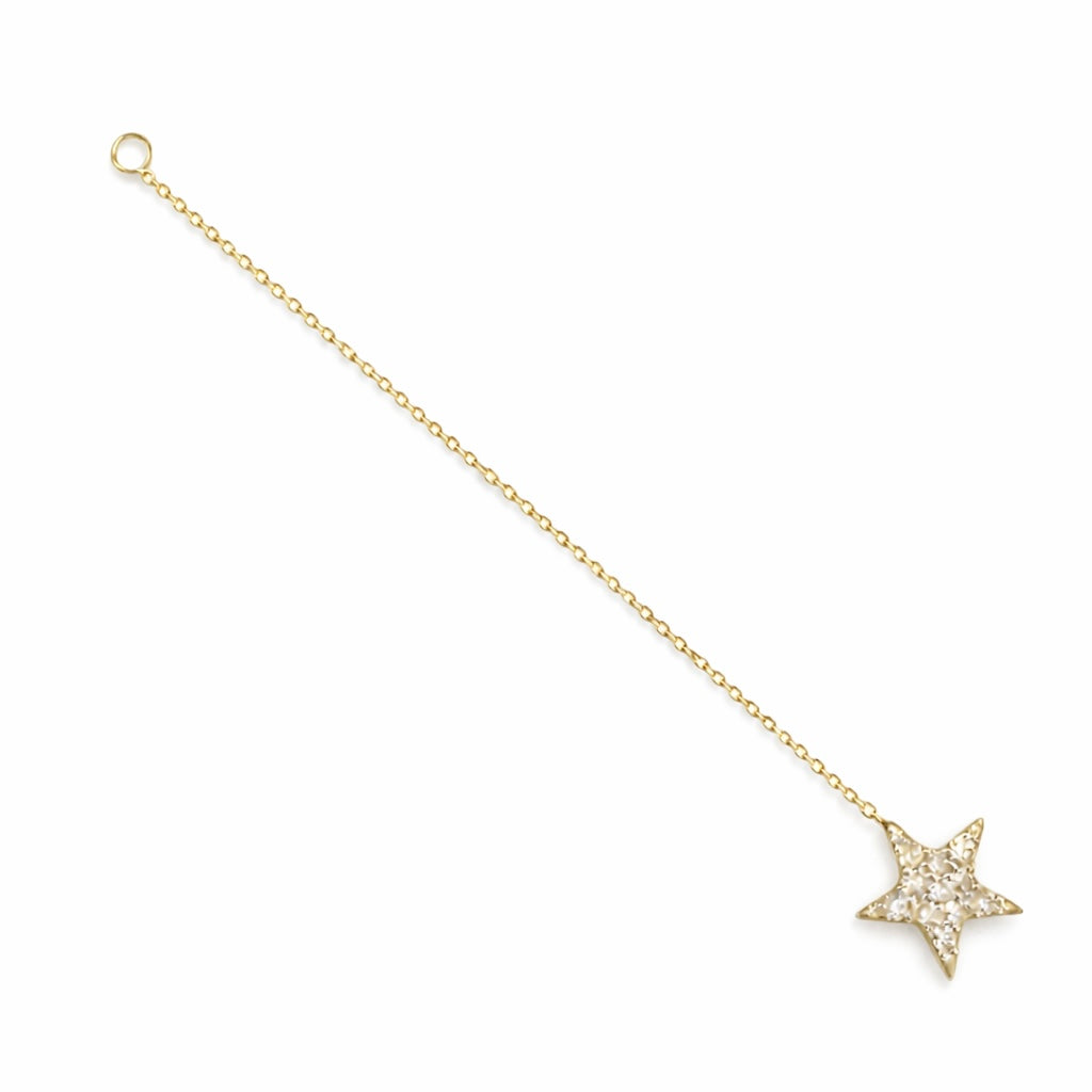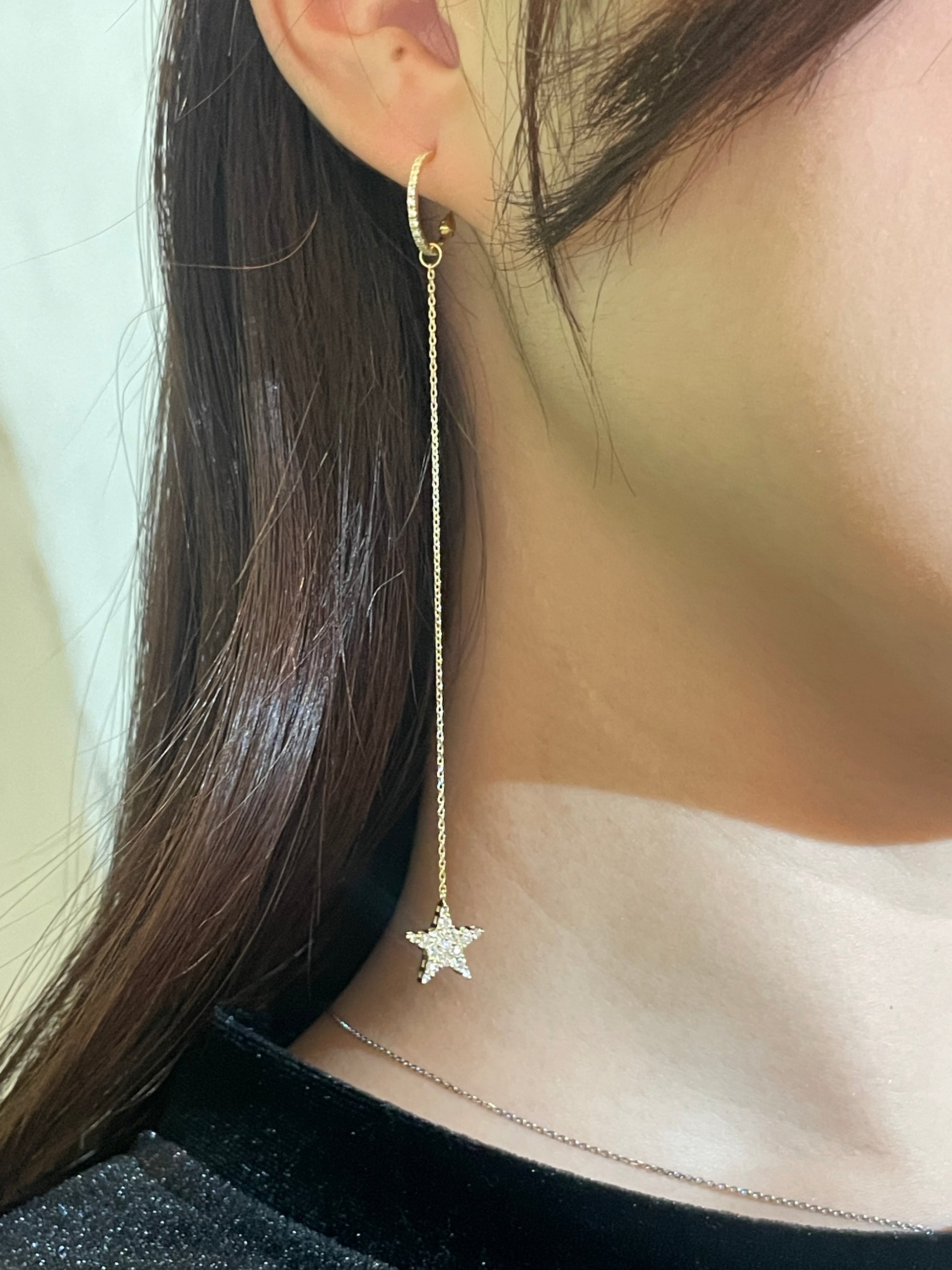 スパイクフープピアスやポスト型のピアスに簡単にプラスできる、揺れるたびに上品な輝きを放つダイヤがたっぷり敷き詰められた星型のロングチェーンチャーム。