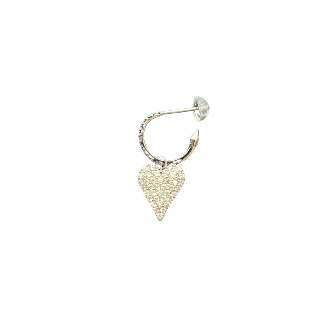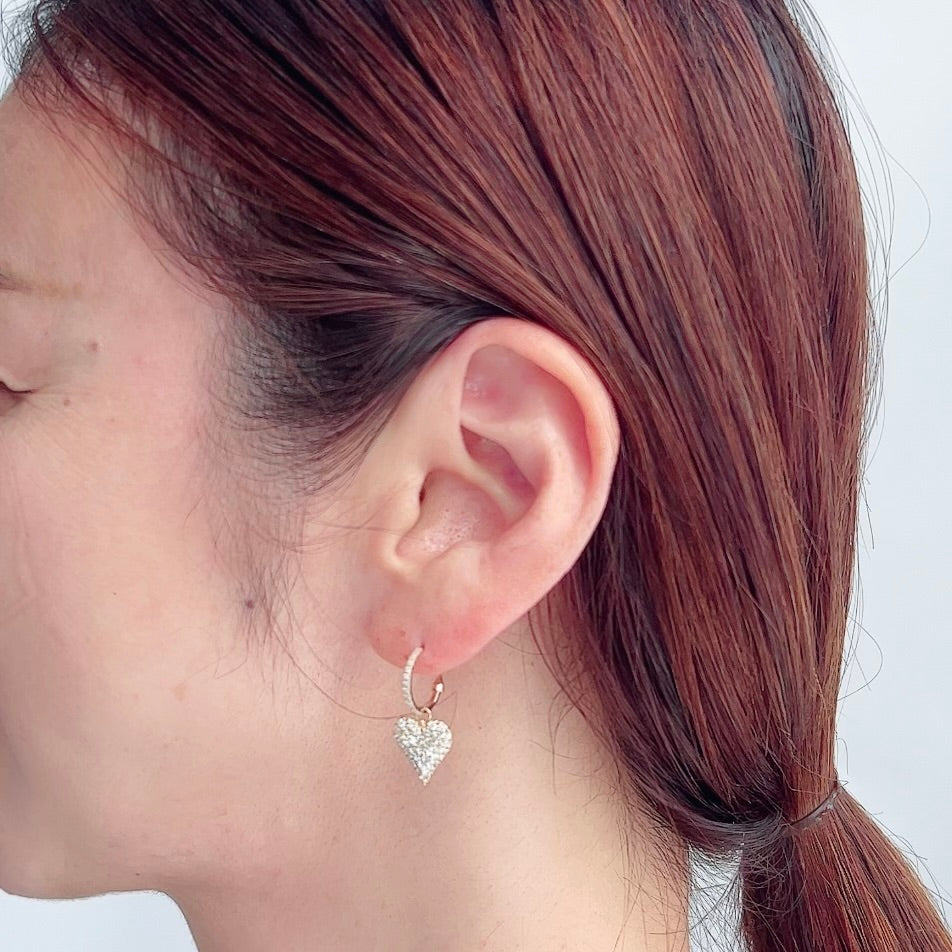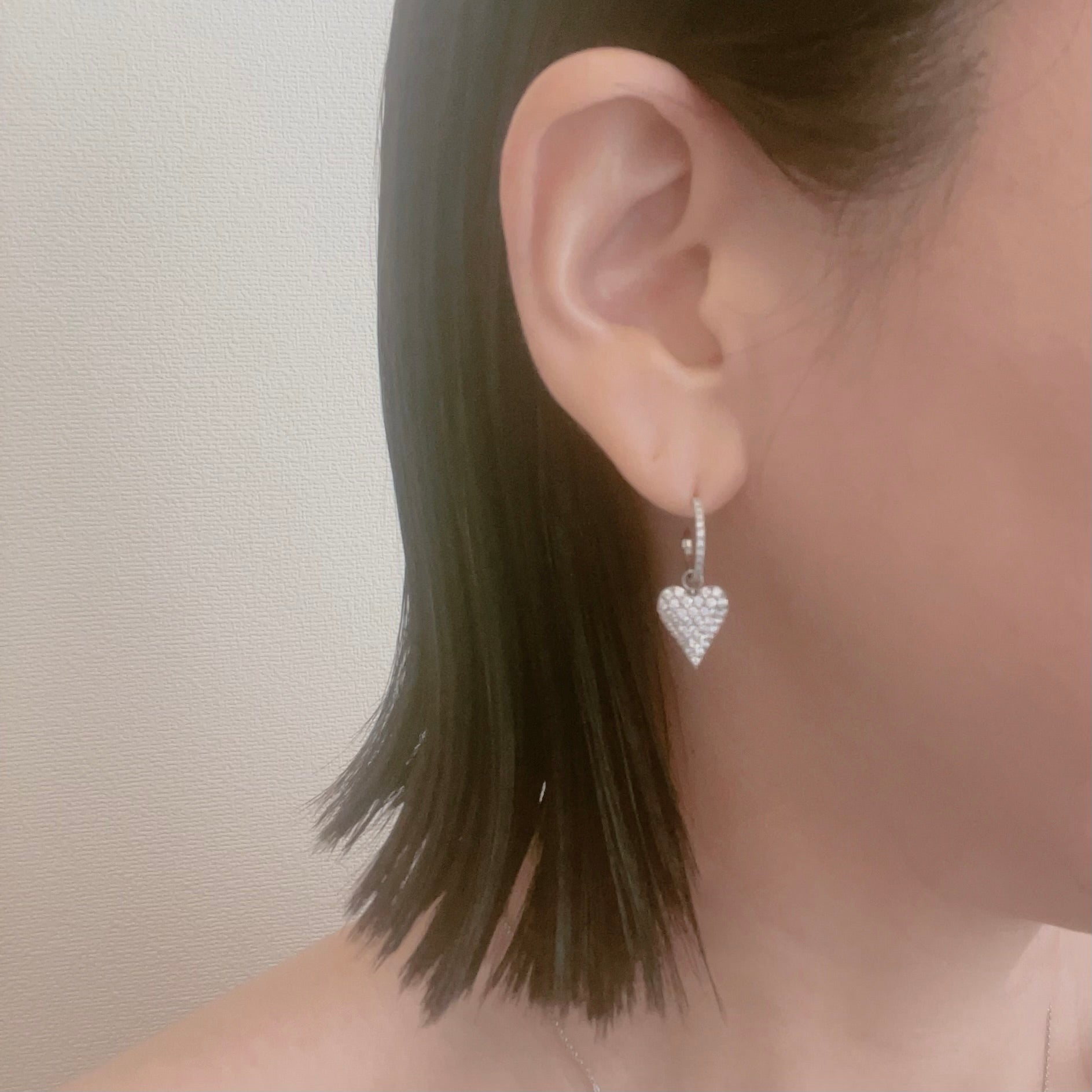 スパイクフープピアスやポスト型のピアスに簡単にプラスできる、上品な輝きを放つダイヤがたっぷり敷き詰められたハート型の着せ替えチャーム。