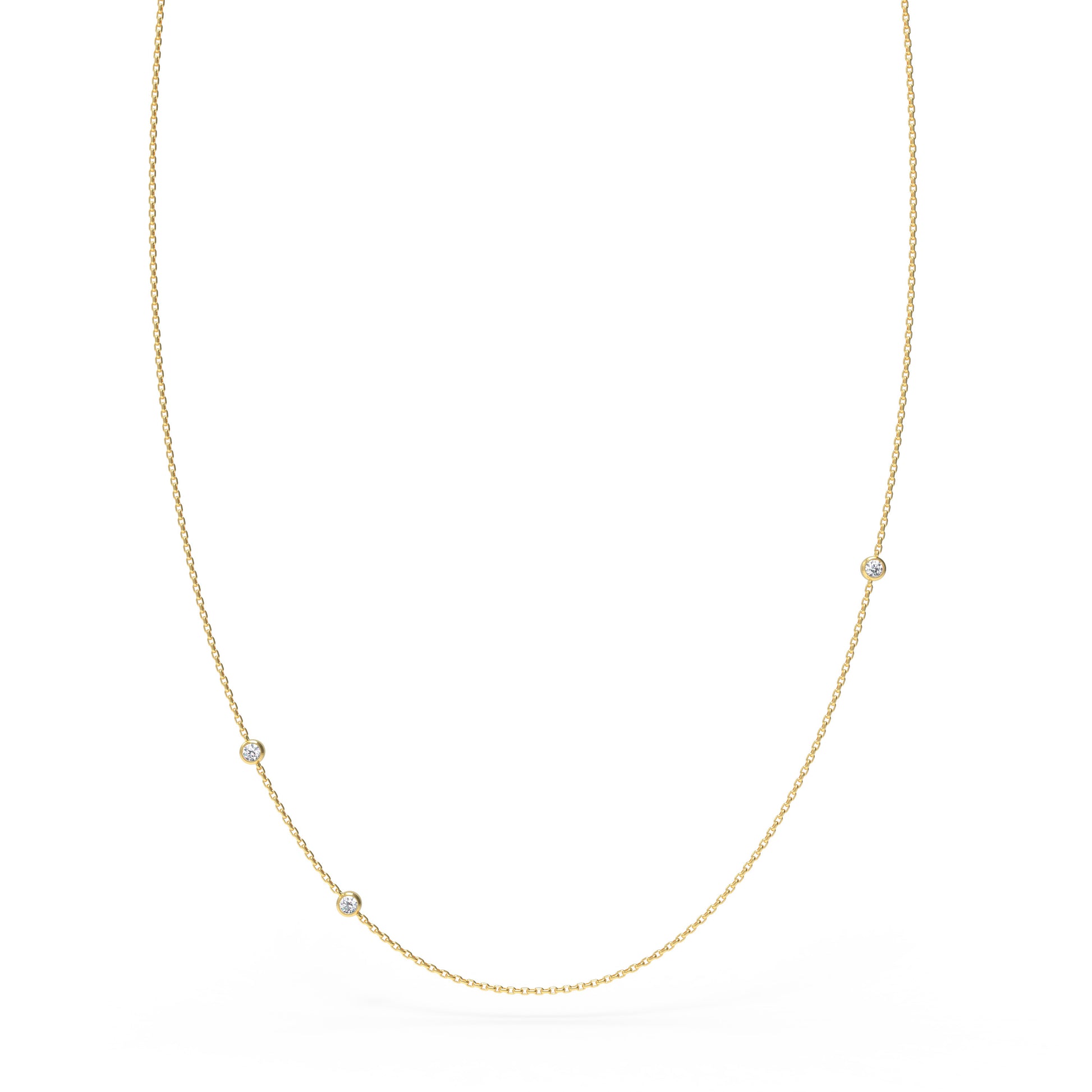 54cmの主役級チェーンネックレスに、0.25ctの最高等級グレードのラボグロウンダイヤモンドを複数のレイヤーに分けて3石配置したシンプルモダンなデザインは洗練された上品な大人のスタイリングに最適。